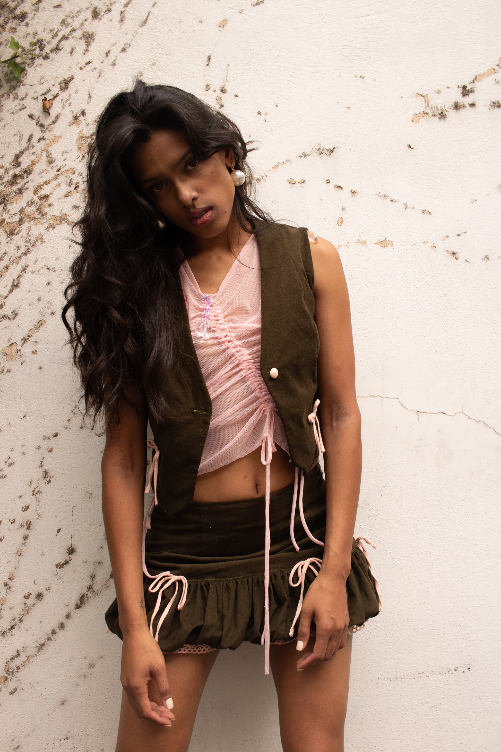 Falda globo con coquetos moños teñidos naturalmente con palo de brasil. Pinzas en delantero y espalda, forrada con cierre invisible en costado.