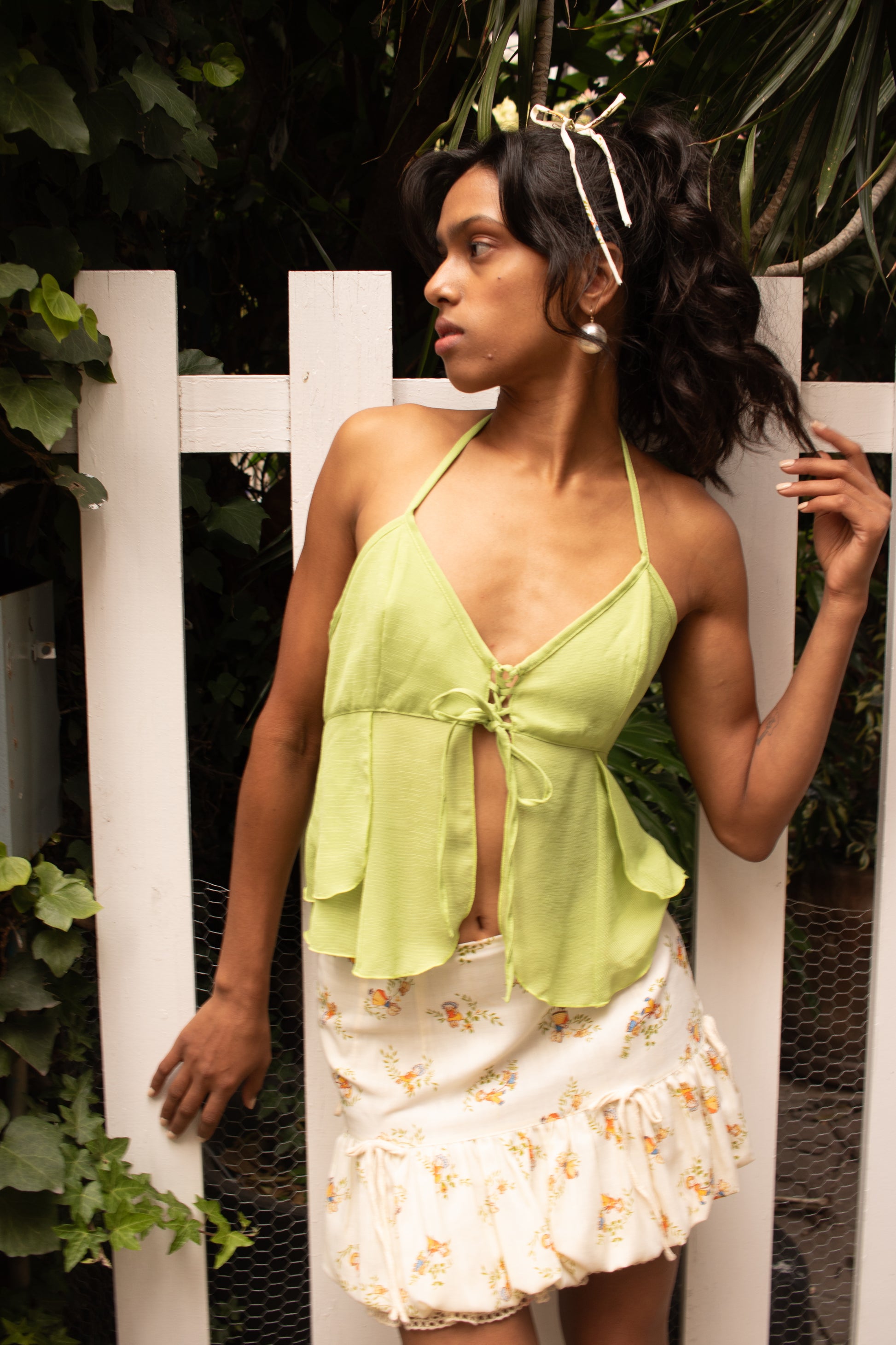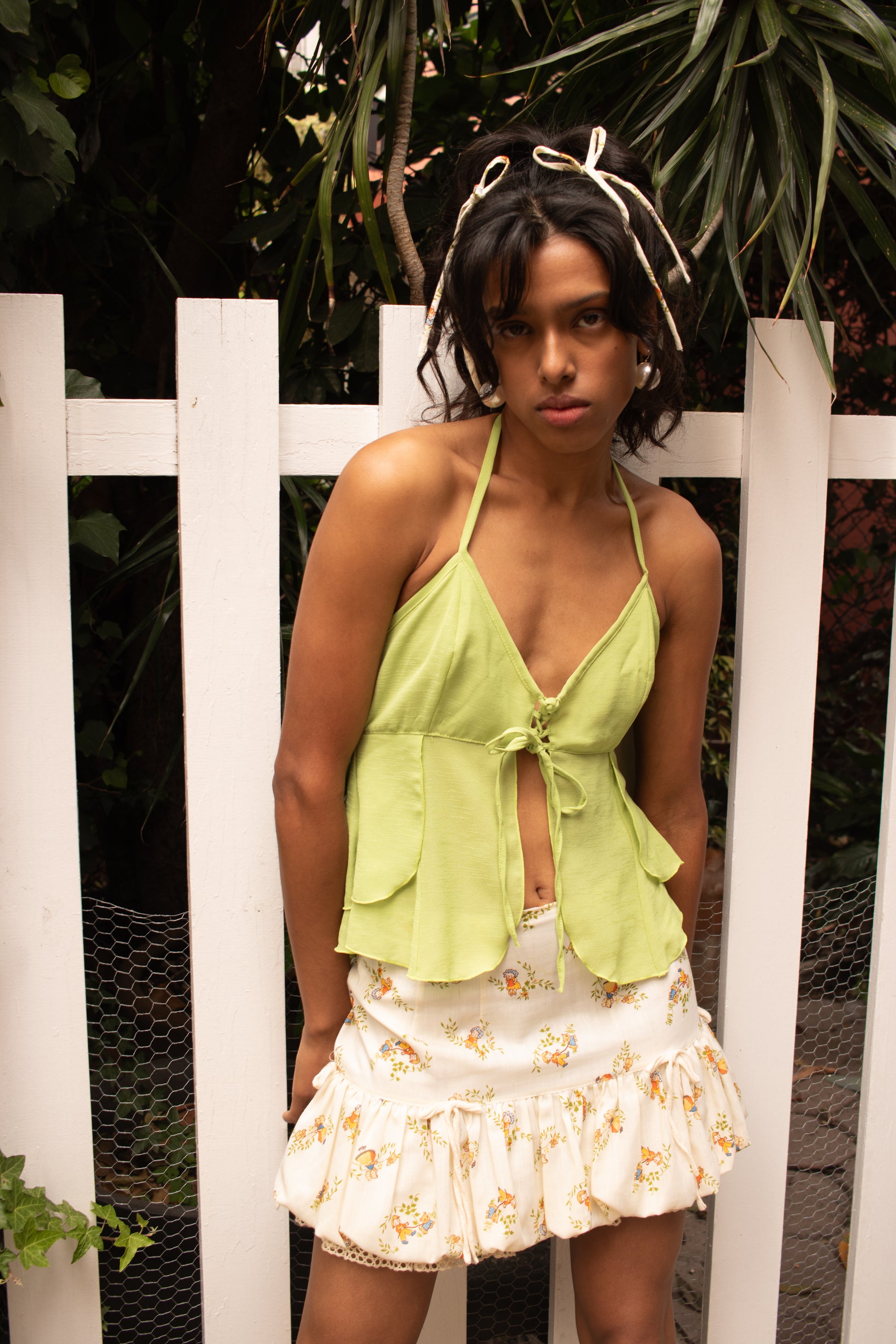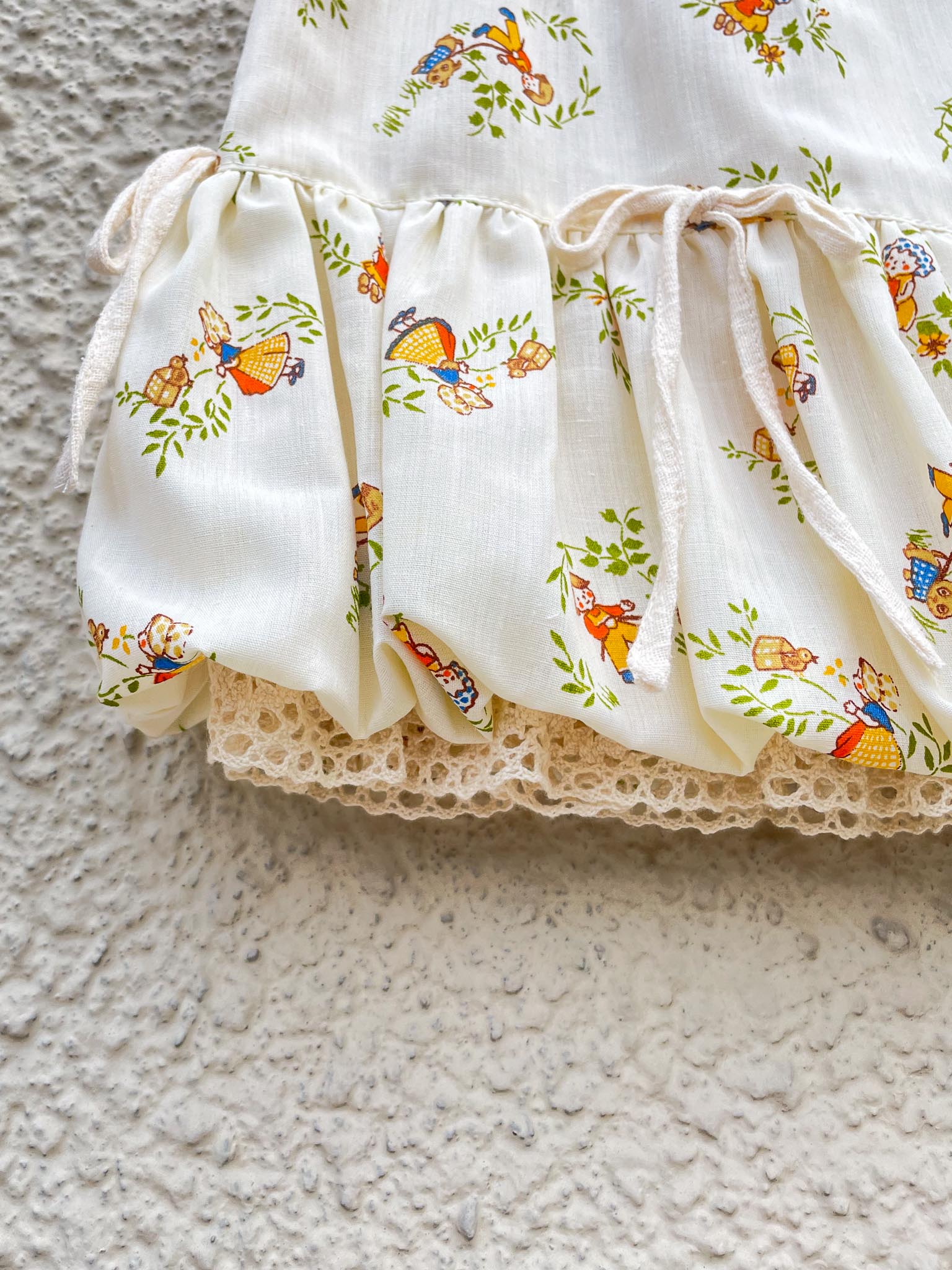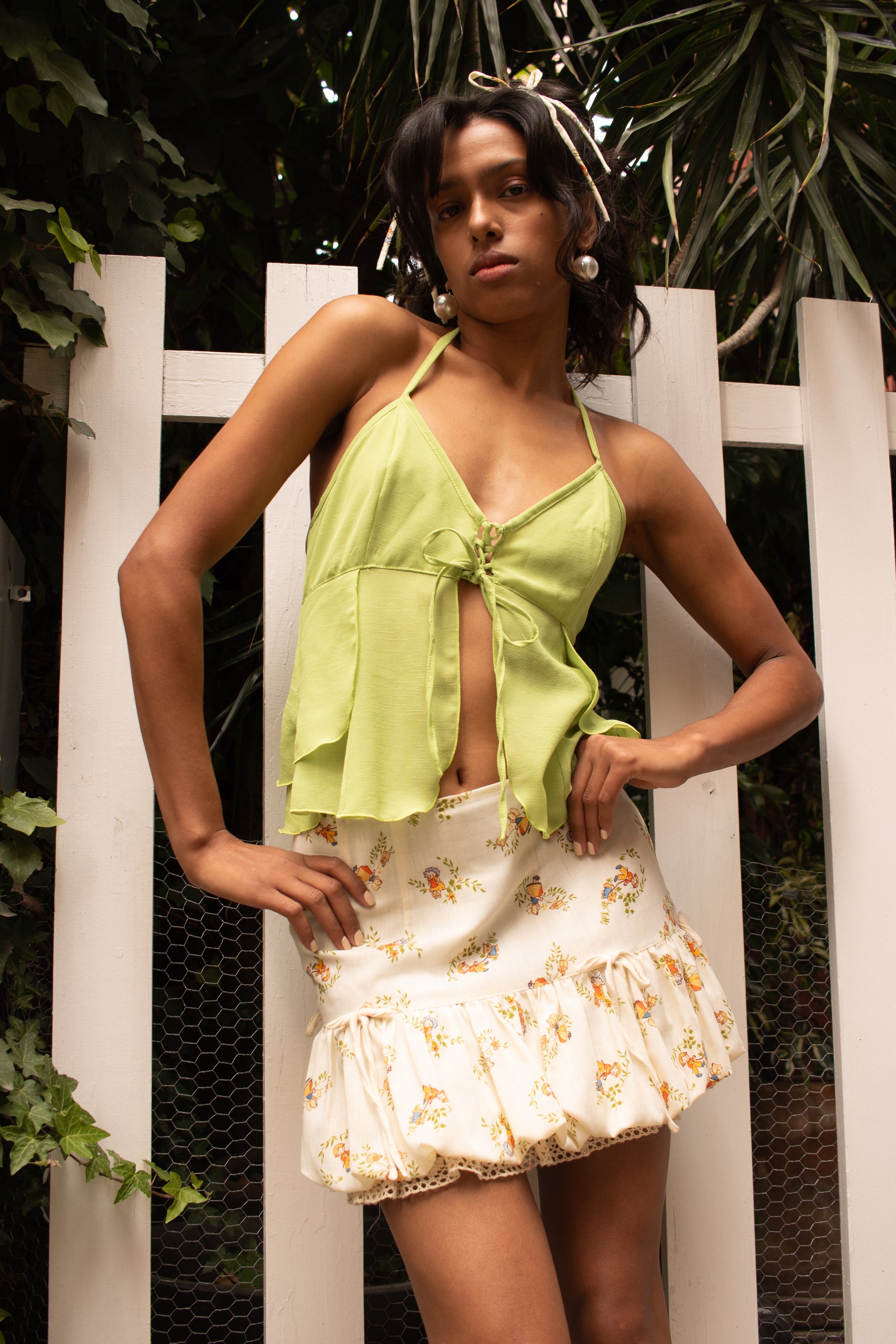 Falda globo forrada con pinzas y moños coquetos en delantero y espalda. Sobresale bolillo de algodón por la parte inferior. Lleva cierre invisible en costado.