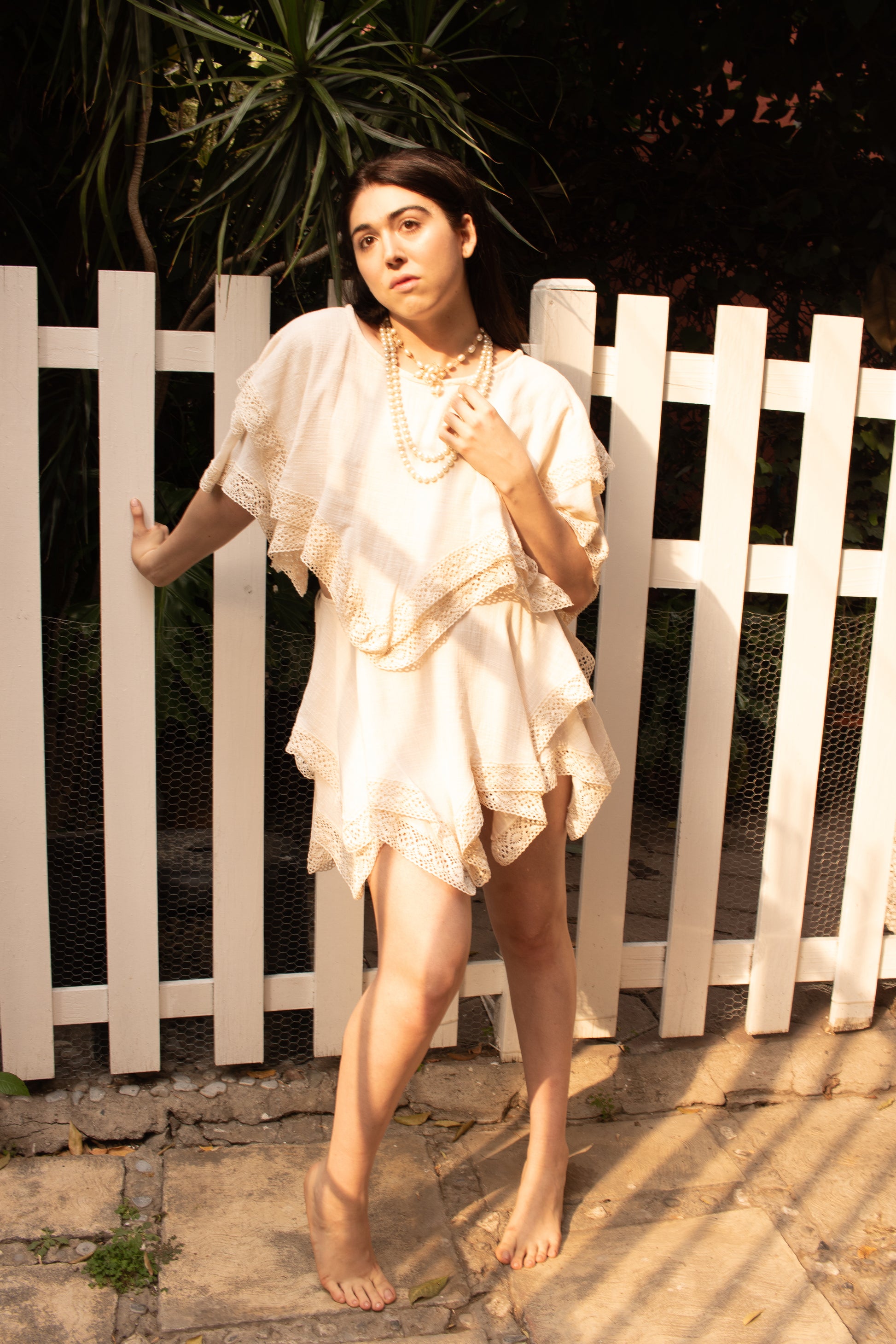 Falda acampanada corte pañuelo, tiene bolillo en todo el borde y pretina delgada ajustada a la cintura
