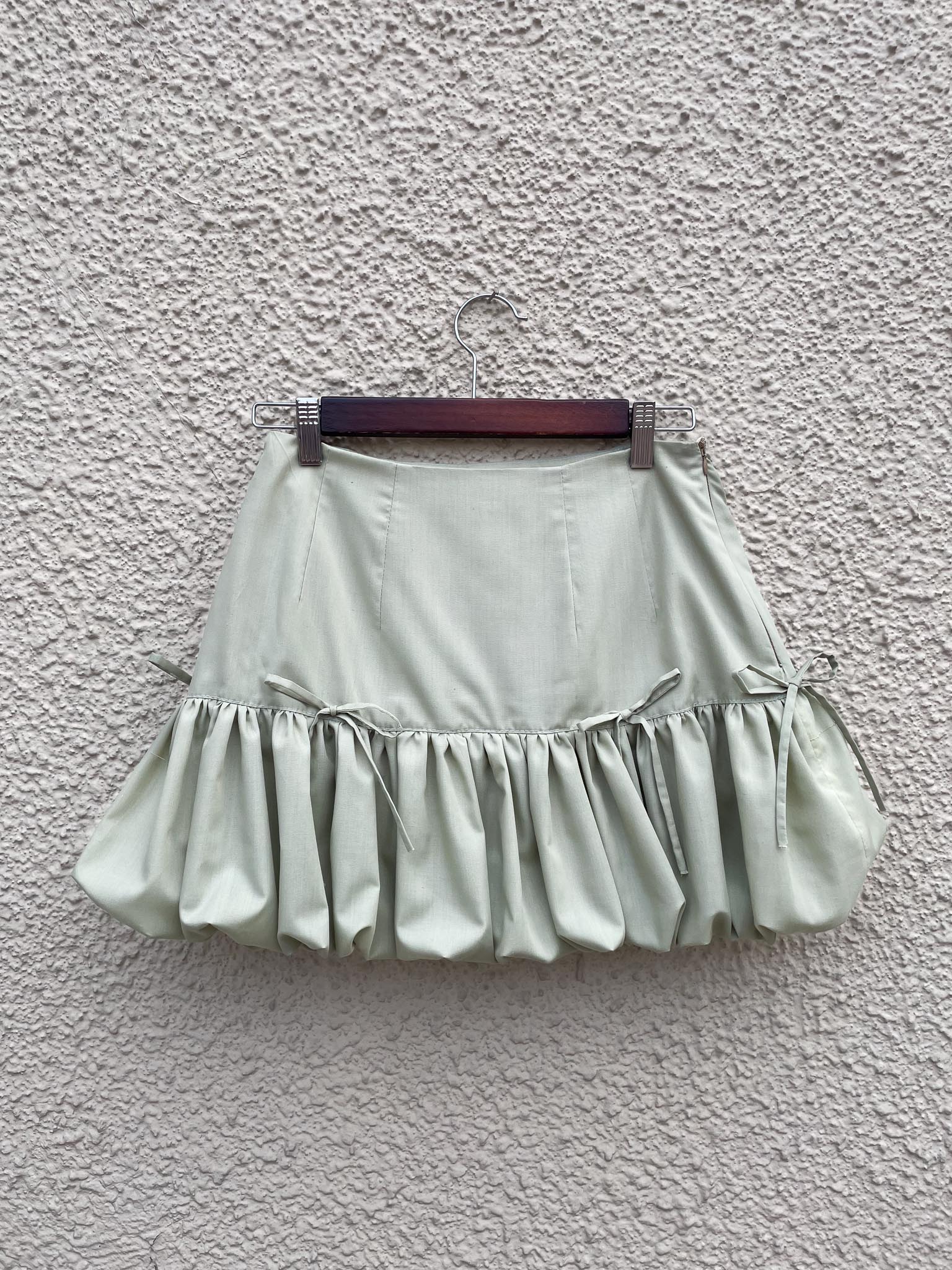 Falda globo con pinzas y moños coquetos en delantero y espalda. Forradas con cierre invisible en costado. Hechas sobre pedido.